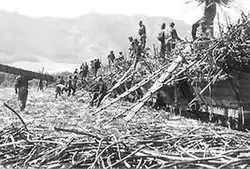 The sugar cane transport was carried out with five steam locomotives.[5] Each of the locomotives could haul up to ten cars loaded with sugar cane.[3] The railway operation was ramped-down in late 1939, because truck transport proved to be more advantageous.[3] By the spring of 1942, road transport had replaced railway locomotives and trucks were used to transport sugar cane to the Kilauea mill.[1]