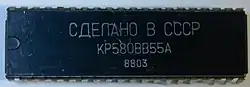 The KR580VM80A (Russian: КР580ВМ80А) is a Soviet microprocessor, a clone of the Intel 8080 CPU.[1][2] Different versions of this CPU were manufactured beginning in the late 1970s, the earliest known use being in the SM1800 computer in 1979. Initially called the K580IK80 (К580ИК80), it was produced in a 48-pin planar metal-ceramic package. Later, a version in a PDIP-40 package was produced and was named the KR580IK80A (КР580ИК80А). The pin layout of the latter completely matched that of Intel's 8080A CPU. In 1986 this CPU received a new part number to conform with the 1980 Soviet integrated circuit designation and became known as the KR580VM80A (КР580ВМ80А), the number it is most widely known by today (the KR580VV51A and KR580VV55A peripheral devices went through similar revisions). Normal clock frequency for the K580IK80A is 2 MHz, with speeds up to 2.5 MHz for the KR580VM80A. The KR580IK80A was manufactured in a 6 μm process.[3] In the later KR580VM80A the feature size was reduced to 5 μm and the die became 20% smaller.[4]