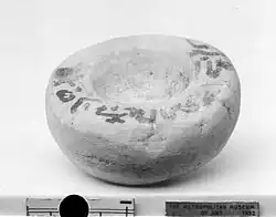 Smaller finds included fragments of vases, bowls, and jars in stone and pottery, burnt pieces of coffins and boxes, the foot and face of a large wooden statue (probably a guardian statue), faience vases and ushabti coffins, and small pieces of inlay.[6][8]