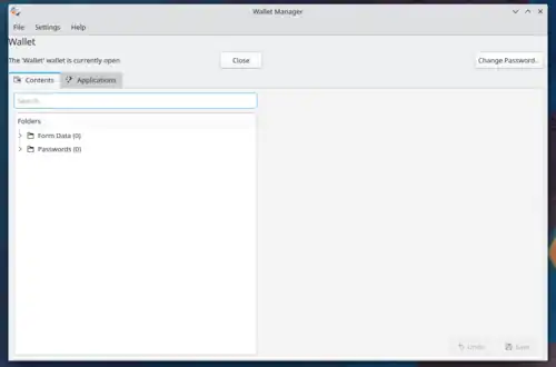 KDE Wallet Manager allows users to save or delete Wallets and users can identify which wallet applications should look in when attempting to access a stored password.[5]