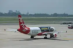 After the airline AirAsia India became an official partner for Kabali, an Airbus A320 owned by the airline was wrapped with the film's title and an image of Rajinikanth depicted as Kabaleeshwaran.[60] It was the first time a passenger jet had been wrapped for advertising an Indian film.[67] The Indian financial company Muthoot FinCorp who is also an official partner of the film produced silver coins embossed with the image of actor as cast in the film.[68][69]