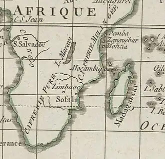 Detail of a 1795 French map distinguishing between "Pure-Blood Cafreria" (Cafrerie Pure) in Southern Africa and "Mixed-Blood Cafreria" (Cafrerie Melangée) inland from the Swahili Coast.