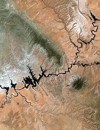 This topography is well illustrated in a synthetic aerial image (here, 450 kB), which looks northwest from a point near Navajo Mountain. The Kaiparowits Plateau is the darker area to the left, while the Escalante River Basin is the lighter area to the right. The Colorado River (as Lake Powell) runs across the bottom of the image, and at the upper right is the Aquarius Plateau and Boulder Mountain.