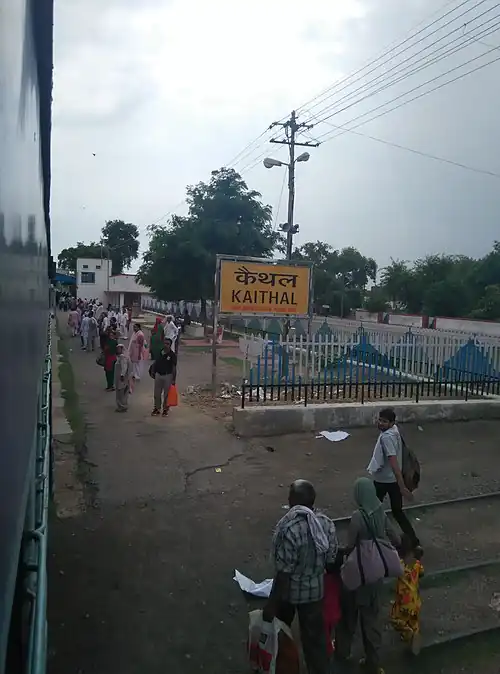 The city have two railway stations named; Kaithal (KLE)[32] and New Kaithal Halt (NKLE).[33] The city had a rail connection to Kurukshetra and Narwana which further went to Jind (local trains only) until 2014, when the government started a rail service between Delhi and Kurukshetra via Kaithal. The move for this service was initiated and pushed by the previous Member of Parliament from Kurukshetra, Naveen Jindal with an aim to give people a convenient mode of transport to reach the capital. Earlier they had to board trains at the Kurukshetra railway station.[34] In 2015, a new express train connecting Chandigarh and Jaipur via Kaithal has been started.