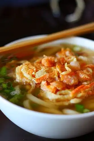 Kakiage may top a bowl of kakesoba (hot soba in broth) or udon.[7]