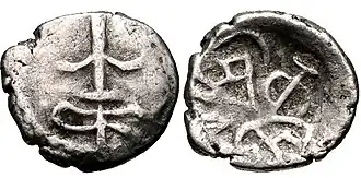 ![]() Silver coin of king Krishnaraja (r. c. 550-575) of the Kalachuri dynasty, on the model of the Western Satraps. | |||||||||