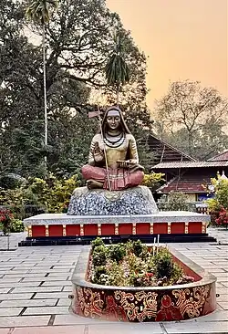 In Malayalam, Kalady means "footprint". The village was previously called Sasalam.[1][8] All traditional and hagiographical sources maintain that Kalady was Shankara's birthplace. It is situated on the banks of river Periyar. Kalady is believed to have been found by a chieftain named Rajasekara, whose dream was influenced by Hindu god Shiva. He also built a temple for Shiva at this place and made a settlement for Brahmins. There are two temples within Kalady - one for Saradamba and other for Shankara as Dakshinamurthi. Sringeri Mutt and Kanchi Mutt have their branches here. A 45 m (148 ft) tall Adi Sankara Kirti Stamba Mandapa was built by Kanchi Mutt under the aegis of its pontiff Chandrasekarendra Saraswati. A Sanskrit University is run by Sringeri Mutt within its grounds. [9]