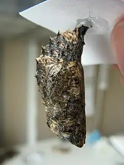 The pupa is simple. It has a gently keeled thorax. The abdomen displays a series of small conical points dorsally. The colour is light brownish and the pupa is embellished with slaty irrorations.[18]