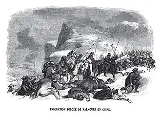 In January 1771 the oppression of Tsarist administration forced the larger part of Kalmyks (33 thousand households, or approximately 170,000–200,000 people) to migrate to Dzungaria.[30]