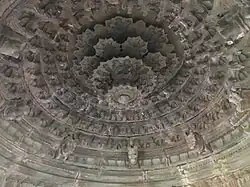 The Kamal Basadi derives its name from the lotus carvings extending from the dome of the centre roof.[8][9][4] The lotus has 72 petals believed to represent 24 tirthankaras of past, present and future. The walls of the temple are engraved with intricate designs, borders, and sculptures.[10] The wall of the temple is supported by pillars with the carving of a cobra at the end of every bracket. The pillars are well-carved with decorations and neatly polished. The shrine has a richly carved doorway.[1] There are a total of five small cells housing idols of tirthankaras; between these cells are four yaksha and yakshi in standing posture under a small canopy. The pillars inside the garbhagriha are square and massive. On each side of the door, there are niches in the wall that have carvings of Jain divinities.[11]