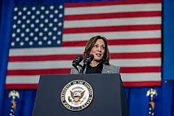 Harris framed her campaign as "a choice between freedom and chaos" and based it around the ideals of "freedom" and "the future".[148][149] The Harris campaign sought to highlight her experience as an attorney general and a prosecutor to "prosecute the case" against Trump by pointing out his 34 felony convictions.[150] Harris ran as a moderate Democrat and moderated several of her policy positions since her 2019 run, with many of her domestic policy stances resembling Biden's.[151][152][15] Harris's stances also had a particular focus on reproductive healthcare.[15]