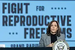 Harris supports national protections for abortion, which were reversed after Roe v. Wade (1973) was overturned by of Supreme Court with Dobbs v. Jackson Women's Health Organization (2022). Under the Biden administration, she prominently campaigned for abortion rights.[16] In March 2024, Harris became the first sitting vice president to visit an abortion clinic, and she told Politico in July 2024 that "we need to put into law the protections of Roe".[163][164]