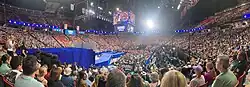 Harris and Walz appeared on August 9 in Glendale, Arizona, at Desert Diamond Arena; U.S. senator Mark Kelly, Arizona attorney general Kris Mayes, U.S. Senate candidate Ruben Gallego (AZ-3), and Republican Mesa mayor John Giles also spoke.[128] Another rally took place the following day in Paradise, Nevada, at the University of Nevada, Las Vegas's Thomas & Mack Center.[129] Before the rally started hundreds of people who wanted to attend the rally were turned away because the venue had reached its capacity. The capacity of the venue is about 18,000 people.[130] According to the campaign, 14,000 people were in the arena and law enforcement closed the doors around 5:45 PM as people who were waiting in line outside became ill. The campaign estimated that 4,000 people were either waiting in line or in their cars when law enforcement closed the doors.[131]