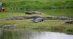 It is also possible that the animals were typically kept apart not by preferences unique to the two species but through preferences based on size, age and sex. In modern saltwater crocodiles, the ranges of nesting females and juveniles often overlap upriver or in areas of denser vegetation, whereas large, adult males prefer deeper open waters. This could explain why the Murgon site primarily preserves large individuals alongside some remains of eggs and hatchlings,[11] with only few animals of intermediate size. Such subadults may have lived largely separate from adults in so called "stockyards", as they would pose a threat to small hatchlings while themselves being threatened by cannibalistic adult males.[2]
