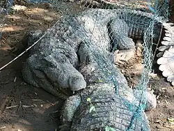 With its appearance generally resembling today's crocodiles, in particular the flat, platyrostral snout, it is generally thought that Kambara was a semi-aquatic generalist.[3][5] One method to determine the details of such a lifestyle may be found in the way the teeth of these crocodilians occlude with another, although the specifics of this are still poorly understood. One hypothesis by Charles C. Mook proposed that an overbite in crocodilians could serve a similar function as the carnassial teeth of mammalian predators, being used to break and slice. This would then suggest that interlocking dentition may be better suited when having to restrain large, struggling prey, requiring greater force that would be more evenly spread out across the toothrow.[5]