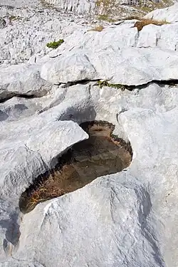 Kamenitzas or solution pans are closed depressions that develop on rock surfaces in karst regions formed by dissolution weathering. Usually they form on horizontal, or slightly inclined limestone pavements where water does not flow but collects into the small depressions. The presence of static water produces small, round, closed pans that are shallow as compared with their depth. Usually they have a diameter of several decimeters, but kamenitzas with a diameter up to 6 m have been documented. Overflow usually creates a solution runnel (karren). This overflow channel often lowers to the extent that it reaches the kamenitza bottom, where further development stops and the pan does not widen any longer. The name kamenitza is of Slavic origin where kamen means pebble. It came from the wrong hypothesis that small pebbles rotating in a water flow are forming the kamenitzas.[1]