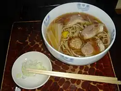 Cold, cooked soba eaten with a dipping sauce of duck meat and Welsh onions. It is said to have been conceived in 1963 at the Ginza Chōji-an (長寿庵) restaurant[21]