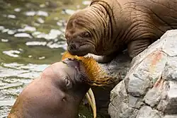 So far, aquarium has succeeded in breeding fish and sea turtles. During 2003, a total of nine killer whales, walruses, Caspian seals, steller sea lions (two), California sea lions (two), and bottlenose dolphins (two) were born.[6][4] In addition, the ocean sunfish named Kukey, who started captivity in 1982, set a world record for captivity for 2,993 days, living for eight years. Kukey was 72 cm (2.36 ft) at the time of delivery, but was 187 cm (6.14 ft) in size at the time of death.[7][8] About 1-3 California sea lions are born every two years. In the past, steller sea lions gave birth at the same pace as other sea lions, but it seems that there are no plans for a while because the male "Nosa" died in 2007.