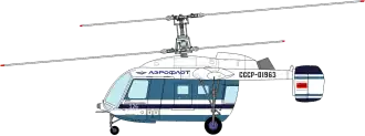 The Kamov Ka-126 (NATO reporting name Hoodlum) is a Soviet light utility helicopter with co-axial rotors. Evolved from Ka-26 with engine pods removed from stub wings, fitted with one TVO-100 turboshaft engine positioned on top of fuselage, modified rotor blades, new fuel system.