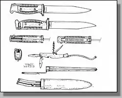 Production largely made the SG 42 from stamped sheet metal parts. The handle scales and sheath are inexpensive and quickly produced, molded phenolic resin parts. The blade length was 179.5 mm (7.07 in), the total length was 304 mm (12.0 in) (317 mm (12.5 in) with sheath). The blade had a fuller. The knife contained a detachable toolkit in the handle that individuals could use for rifle maintenance and other tasks. The toolkit included a screwdriver, small knife, awl, and a corkscrew. The protective bracket of the handle served as a cartridge case extractor.