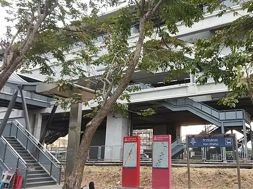 Kan Kheha station (Thai: สถานีการเคหะ) is a railway station in Don Mueang District, Bangkok. It serves the SRT Dark Red Line. Kan Kheha station was built above the existing Kan Kheha KM.19 ground-level railway halt on the State Railway of Thailand's Northern and Northeastern Main Line which primarily served commuter trains.