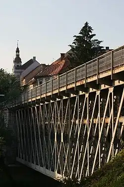 The Kandija Bridge (in Slovene: Kandijski most), or the Old Bridge (Stari most) is an iron bridge in Novo Mesto, Slovenia. It connects the old city core on the left side of the Krka River with Kandija, a historical suburb of Novo Mesto, on its right side.[1] The bridge stands at the lower part of Main Square.[1] It was built in 1898 to replace the old wooden bridge from 1600, located a few dozen metres upstream.[1] The opening took place on 23 November 1898. The riveted structure bridging the Krka with a single 75-metre (246 ft) arch is a unique structure in Slovenia.[1] Since 1992, it has been protected as a cultural monument. It was renovated in 1977, 1996, and 2009.