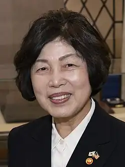 She became a professor at her alma mater in 1988 and served as its president from 2016 to 2020.[1] Kang served as a member of the Presidential Committee on Regulatory Reform and the National Economic Advisory Council during the conservative Lee Myung Bak government.[1] In December 2023, President Yoon nominated Kan to be the Minister of Patriots and Veterans Affairs whicg was officially confirmed by the National Assembly on 26 December, thus becoming the second woman to hold that position.[1]