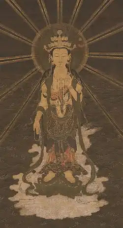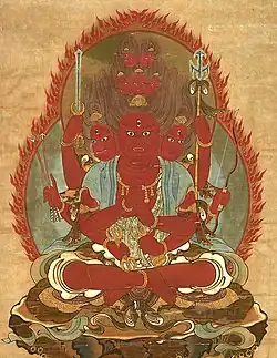 Kangiten is commonly identified as an "assimilation / emanation body" (等流身, tōrujin; Sanskrit: niṣyanda-kāya[90]) of Vairochana,[14] with the female half of the embracing pair being also identified as a manifestation of the Eleven-Headed Avalokiteshvara.[91][92] In addition to these two, he was also connected or identified with other deities such as Maheshvara-Daijizaiten, the wrathful hearth god Sanbō Kōjin, the snake god Ugajin, Enma (Yama), Benzaiten (Sarasvati), the fox goddess Dakiniten, and the wisdom king Aizen Myōō (Ragaraja).[93]