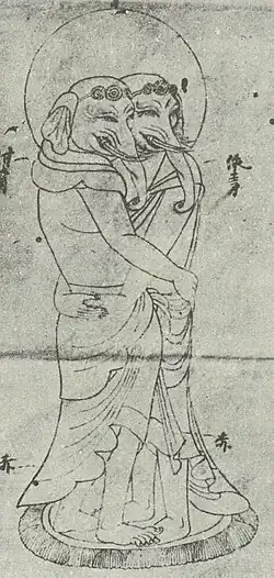 The origins of this imagery, unique to East Asia, have perplexed scholars for years; there is no concrete evidence about the inception of this form. It has been compared with the sexual yab-yum iconography found in Nepal and Tibet,[2] although it is markedly different from them in that both figures have animal heads (yab-yum representations are restricted to fully humanoid deities; the zoocephalic Vinayaka-Ganapati was thus not portrayed in this form, though erotic depictions of him do exist) and are shown fully clothed.[33][34] Lode Rosseels suggests that the Dual Vinayaka form may have originated from an iconographic type attested in Xinjiang (Chinese Turkestan) and Dunhuang in the 8th century showing Ganapati with four legs (representing the deity's union with his shakti in a non-sexual fashion),[35] which was "reinterpreted by the Chinese in accordance with popular Taoist ideals ... which probably resulted in the restoration of the four-legged and four-armed form to two almost identical elephant-headed deities in a nonsexual embrace."[36]