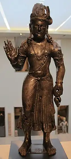 The emergence of Esoteric (Tantric) Buddhism and its spread to Nepal, Tibet, and eventually to East Asia saw Vinayaka acquire a more positive role as a subjugator of demons. In Tibet, the deity was worshiped for the removal of obstacles and the granting of wealth and was at times portrayed as a wrathful, multiarmed deity wielding weapons. A Nepalese text provides a list of spells invoking Ganapati to not only bestow wealth but also to cause harm to enemies.[24] Vinayaka is also depicted in a wall painting in Mogao Cave 285 in Dunhuang as a protector of Buddhism with the gods Maheshvara (Shiva) and Skanda.[25][26]