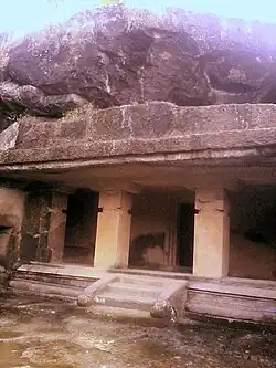 The Kanheri Caves (Kānherī-guhā [kaːnʱeɾiː ɡuɦaː]) are a group of caves and rock-cut monuments cut into a massive basalt outcrop in the forests of the Sanjay Gandhi National Park, on the island of Salsette in the western outskirts of Mumbai, India. They contain Buddhist sculptures and relief carvings, paintings and inscriptions, dating from the 1st century CE[1] to the 10th century CE. Kanheri comes from the Sanskrit Krishnagiri, which means "black mountain".[2]