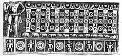 Over the cistern and on the pilasters of the veranda are inscriptions which at first sight appear to be in a tabular form and in characters met with nowhere else; they are in Pahlavi.[13]