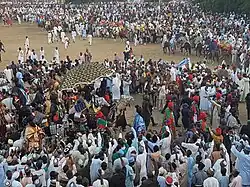 Kano is traditionally an equestrian society and this is manifested during the annual Durbar festival[57] to mark and celebrate the two annual Muslim festivals Eid al-Fitr (to mark the end of the Holy Month of Ramadan) and Eid al-Adha (to mark the Hajj Holy Pilgrimage). Kano Durbar Festival is the Nigeria's Most Spectacular Horseparade that marks a celebration of northern Nigeria's cultural treasure.[57][58] The festival begins with skilled horsemen from the royal court and aristocrats being accompanied by musicians, artillerymen, and traditional circus in a procession of highly rich and colorful style through the city on the way to the emir's palace. Once assembled near the palace, the horsemen separate into their respective groups, each under the banner of district head (hakimai) or a titled nobleman from the emir's court (masarauta), take it in turns to charge toward the emir, pulling up just feet in front of the seated dignitaries to offer their respect and allegiance. During the festival, the emir makes a beautiful appearance in different colors dressed and adorned with the attire of a king.[59]