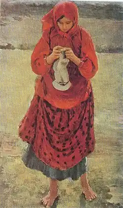 Art and local historian Peter Dulsky wrote that Nicolai Fechin had the idea of painting Kapustnitsa in 1907.[2][21] The creation of the painting was preceded by a long period of work by the artist, collecting materials from the field, determining the color and composition. It is believed that the artist collected materials in Pushkarka near Arzamas in preparation for the future final work.[22][23][6] Dmitry Seryakov, a student of art history, claimed that the artist came to Pushkarka to make sketches and that it was here that he had the idea for the canvas.[21] Nicolai Fechin made numerous pencil sketches, studies and sketches of compositions in the technique of oil painting.[2][6] To date, only two drawings are known to experts — Peasant Woman (Young Woman with a Tray) (1909, paper, charcoal, 22 × 16 inches) and Peasant Woman in a Jacket (1909, paper, charcoal, 23 × 14 inches). Both were for a long time in the private collection of Iya Feshina-Brenham, the artist's daughter, in Taos, New Mexico in the United States.[24] There is also a known pastel sketch (1909, paper, pastel, 64 × 43 cm, Samara Regional Art Museum, Zh-902, the sketch came in 1956 from the Ministry of Culture of the RSFSR)[25] and three or four gouache sketches (State Museum of Fine Arts of the Republic of Tatarstan):[6] Kapustnitsa (1909, paper, ink, gouache, sheet size — 23.5 × 33.2 cm, drawing size — 14.2 × 23.9 cm, inv. g-1844), Kapustnitaa (1909, paper, cardboard, ink, gouache, 22.9 × 34 cm, 15.5 × 27 cm, inv. g-1834), Kapustnitsa (1909, paper, cardboard, ink, gouache, 22.9×34 cm, 15.5 × 27 cm, inv. g-1834), Kapustnitsa (1909, paper, gouache, sheet size — 23.5 × 33.4 cm, the size of the figure — 15 × 27 cm, g-1848).[26][Note 1][27]