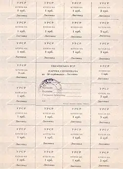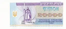 The Karbovanets (Ukrainian: карбованець, romanized: karbovanets', plural: карбованці, karbovantsi for 2–4, or карбованців, karbovantsiv for 5 or more), also colloquially known as kupon (купон, plural: купони, kupony) or coupon from the banknote printing, is a former unit of currency in Ukraine in three separate periods of the 20th century. It is also a predecessor currency of today's Ukrainian hryvnia. The karbovanets was subdivided into one hundred kopiykas, but no denominations in kopiykas were ever issued, owing to inflation.