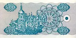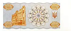 In 1991, notes were introduced in denominations of 1, 3, 5, 10, 25, 50, and 100 karbovantsiv (also called kupons[6] or coupons). All 1991 banknotes were of the same design, picturing Lybid from the monument of the founders of Kyiv on the obverse and the Sophia Cathedral on the reverse. The banknotes did not carry individual serial numbers or signatures. In 1992, banknotes for 100, 200, 500, and 1,000 karbovantsiv were issued, which carried serial numbers.