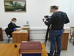 An employee of the research center works with the archive materials. Shooting a reportage for the Karelia State Television and Radio Broadcasting Company, 2021.