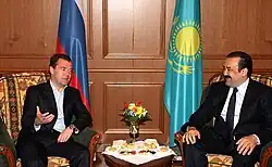 President Nursultan Nazarbayev nominated Massimov to succeed Daniyal Akhmetov as Prime Minister on 9 January 2007.[2] Akhmetov resigned on 8 January without explanation. Analysts attributed Akhmetov's political downfall to the Nazarbayev's criticism of his administrative oversight of the economy.[2][30] The Parliament voted overwhelmingly in favor of the nomination on 10 January with 37 out of 39 Senators and 66 of 77 Mäjilis deputies voting for Massimov. Akhmetov became the defense minister, replacing Mukhtar Altynbayev.[31]