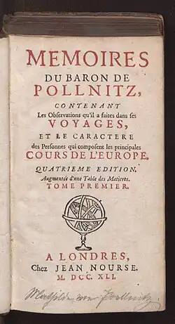 Pöllnitz's Mémoires (Liège, 1734), which were translated into German (Frankfurt, 1735), give interesting glimpses of his life and the people whom he met, but they are very untrustworthy. He also wrote Nouveaux mémoires (Amsterdam, 1737); Etat abrégé de la cour de Saxe sous le règne d'Auguste III. (Frankfurt, 1734; Ger. trans., Breslau, 1736); and Mémoires pour servir a l'histoire des quatres derniers souverains de la maison de Branderibourg, published by F. L. Brunn (Berlin, 1791; Ger. trans., Berlin, 1791).[1]