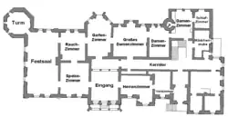 The design is said to have been loosely inspired by the French Château de Chambord. A set of notable original wall decorations have been preserved in the main hall of the castle. The park surrounding the castle, laid out at the time of the construction of the castle but subsequently much altered, was designed by Peter Joseph Lenné.[1]