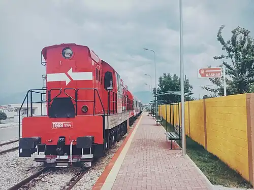 The branch from Vora to Tirana was closed in 2013 and passenger workings were replaced by a bus service.[1] In 2015, the bus journey was shortened when Kashar station re-opened with the benefit of a refurbishment, allowing travelers to journey to at least the outskirts of Tirana. The new service was inaugurated on 26 May by Ilir Meta (then Parliamentary Speaker) and Minister of Transport and Infrastructure Edmond Haxhinasto.[2] Despite the optimism which accompanied the refurbishment and reopening of Kashar station, Tirana's mayor, Lulzim Basha criticised the delay in the reopening of the remainder of the line to Tirana, as Kashar is still ten kilometers away from the city centre, with the distance and the slow operating speeds meaning that the service was underused.[3] It closed completely in 2018 and the tracks have been removed