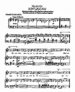 "Kassaman",[1][2] or "Qassaman"[3] (Arabic: قَسَمًا, romanized: Qasaman, "we pledge",[1][2] "the oath" or "we swear"[3]), is the national anthem of Algeria. Moufdi Zakaria authored the lyrics, while the music was composed by Egyptian composer Mohamed Fawzi. The song was adopted as the national anthem in 1962, when the country gained independence from France.