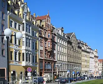On the west side of the street, the preserved Baroque buildings (No. 3, 11, 21,[4] 23) as well as Kretschmanns Hof (No. 17) and the Renaissance Revival architecture building from 1896 (No. 13) have been extensively renovated, for the Hansen House (No. 19[5]) the renovation is still pending (as of April 2023). Through Kretschmanns Hof and No. 13, passages lead to Hainstrasse to the houses Blauer und Goldener Stern (Blue and golden star) and Großer Joachimsthal. The Alte Waage (No. 1) and houses Nos. 5–9, which were also destroyed in the war, were replaced by new buildings.