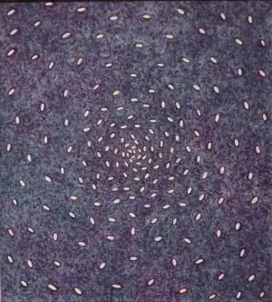 The artist describes her style as "metaphoric abstraction".[2] It consists of an allover deployment of geometric images, often suggesting celestial objects,[3] as in Hypnotic Flight, from the collection of the Honolulu Museum of Art. The Ackland Art Museum (Chapel Hill, NC), the Albright–Knox Art Gallery (Buffalo, NY), the Cleveland Museum of Art, the Grey Art Gallery (New York City), the Honolulu Museum of Art, the Maier Museum of Art (Lynchburg, VA), the Milwaukee Art Museum, the Museum of Contemporary Art (Miami, FL), the Nelson-Atkins Museum of Art (Kansas City, MO), and The Phillips Collection (Washington, D.C.) are among the public collections holding works by Muehlemann.[1][4]