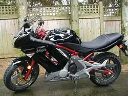 The Kawasaki Ninja 650R, also called ER-6f or EХ-6, is a motorcycle in the Ninja series from the Japanese manufacturer Kawasaki Motors sold since 2006. In 2012, the R suffix was dropped from its name.[2] It is a middleweight, parallel-twin engined motorcycle, designed for normal use on paved roads. They have modern styling and features, with low-seating ergonomics and a low center of gravity. The engine has a 180° crankshaft, resulting in an uneven firing interval of 180° and 540°.