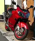 The 2002 model was updated with 142 changes.[4] While some of those changes made the bike easier to launch- such as a heavier crankshaft, a reshaped flywheel, and fuel mapping changes- it had 1.3 hp (0.97 kW) less than the 2000 and 2001 models' 162.7 hp (121.3 kW).[4] It had a revised suspension with stiffer front fork springs and a softer rear shock spring. The front fender had cosmetic changes, and panels were added to the inner fairing below the instruments and bars. The centrally located ram-air intake scoop protruding from the fairing that takes advantage of the higher front air pressure was revised. This intake is integrated into a wider and shorter front cowling from Kawasaki Aerospace Company division, lowering the drag coefficient by one point from 33 to 32.[25][11] The last update was in 2004, with the addition of radial brakes and more fuel injection changes. The ZX-12R was discontinued in 2006, and was followed by the 2006ZX-14 (ZZR1400) which had a similar monocoque frame.