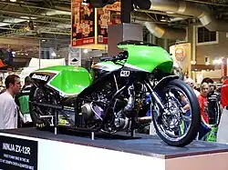 The Kawasaki Ninja ZX-12R is a motorcycle in the Ninja sport bike series made by Kawasaki from 2000 through 2006. The 1,199 cc (73.2 cu in) inline-four engine produced 178 hp (133 kW) at low speed, and increased to 190 hp (140 kW) at high speed due to its ram-air intake,[8][9][10] making it the most powerful production motorcycle up to 2006 and the release of the ZX-14.[6][11] It was a contender to be the fastest production motorcycle, and played a role in bringing to a truce the escalating competition to build an ever-faster motorcycle. Its top speed was electronically limited to 186 mph (300 km/h), tying it with the Suzuki Hayabusa and Kawasaki Ninja ZX-14 as the fastest production motorcycle on the market, after the 303–312 km/h (188–194 mph) 1999 Hayabusa was replaced with a speed-limited version as part of a gentlemen's agreement between motorcycle manufacturers that lasted until the 298–311 km/h (185.4–193.24 mph) 2007 MV Agusta F4 R 312.[3][12][13][14]