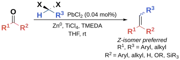 - ^ Takai, Kazuhiko; Kakiuchi, Tadahiro; Kataoka, Yasutaka; Utimoto, Kiitiro (1994-05-01). "A Novel Catalytic Effect of Lead on the Reduction of a Zinc Carbenoid with Zinc Metal Leading to a Geminal Dizinc Compound. Acceleration of the Wittig-Type Olefination with the RCHX2-TiCl4-Zn Systems by Addition of Lead". The Journal of Organic Chemistry. 59 (10): 2668–2670. doi:10.1021/jo00089a002. ISSN 0022-3263.