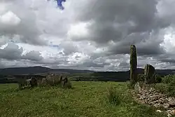 This well-known stone circle is set on the slopes of Maughanclea Hill at 120–150 metres (400–500 ft) overlooking Bantry Bay on ground that would have been suitable for cultivation. Breeny More stone circle can be seen in the distance to the southwest. The stones are positioned in a somewhat elliptical shape, about 2.8 by 2.4 metres (9 ft 2 in × 7 ft 10 in), and there are two tall upright standing stones and a ring cairn nearby.[4][5] Excavation in 1938 led to the idea that the large stone on the north side of the circle was the axial stone but in 1984 Ó Nualláin considered that the small slab 0.76 metres (2 ft 6 in) high at the southwest was really the axial stone.[5][6][4] The portal stones, the two on the opposite side from the axial, are both about 1.2 metres (3 ft 11 in) high but they are very different in width – 1.2 metres (3 ft 11 in) and 0.5 metres (1 ft 8 in).[4]