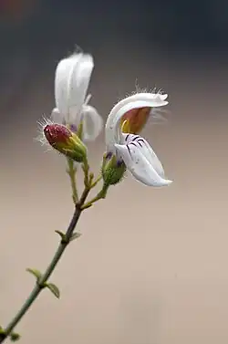 The shrub produces tall inflorescences which are loose, glandular spikes of flowers. Each flower is one to two centimeters wide with five pale pink or pinkish-streaked white lobes whose external surfaces have long, shiny hairs. The three lower lobes curl outward from the mouth and under, and the two upper lobes are joined into a lip that curves forward over the mouth. Within the mouth are long stamen filaments bearing anthers, and a flat, hairless, sterile stamen called a staminode.
